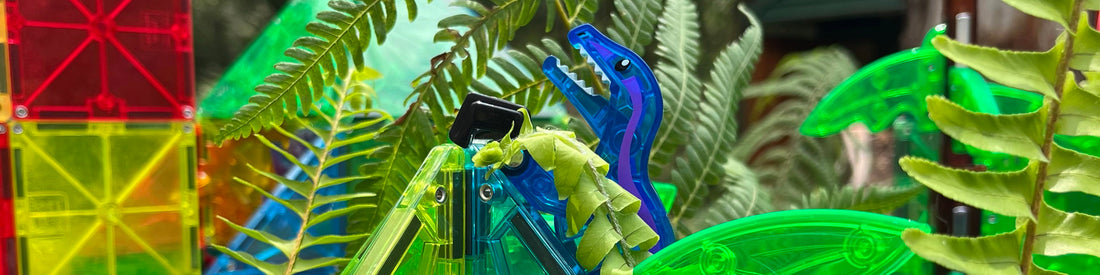 Magna-Tiles bieten so viele Möglichkeiten für kreatives, ergebnisoffenes Spielen, und es können so viele zusätzliche Elemente eingebracht werden, um das Spiel zu erweitern. Unsere Kinder ließen sich von der natürlichen Umgebung unseres Gartens inspirieren, Baumfarne und anderes Laub in ihr Stadtbild einzubauen.
