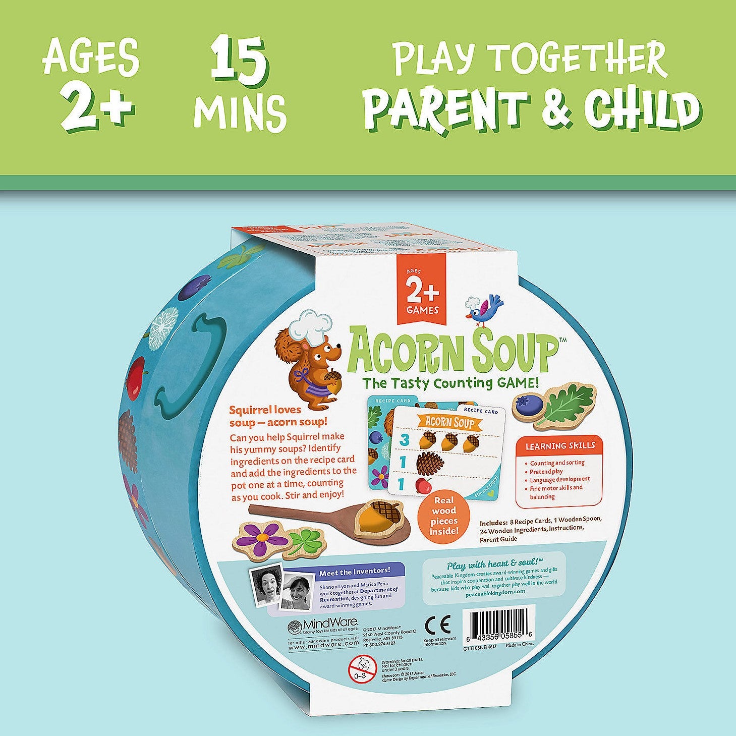 The round box bottom doubles as a bowl, which contains wooden ingredients and a sturdy wooden spoon for mixing and stirring.