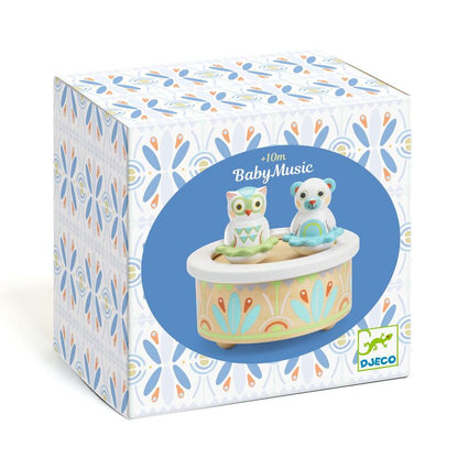 Runde Spieluhr mit zwei wunderschönen Tierfiguren und einer sanften Melodie.