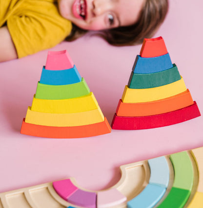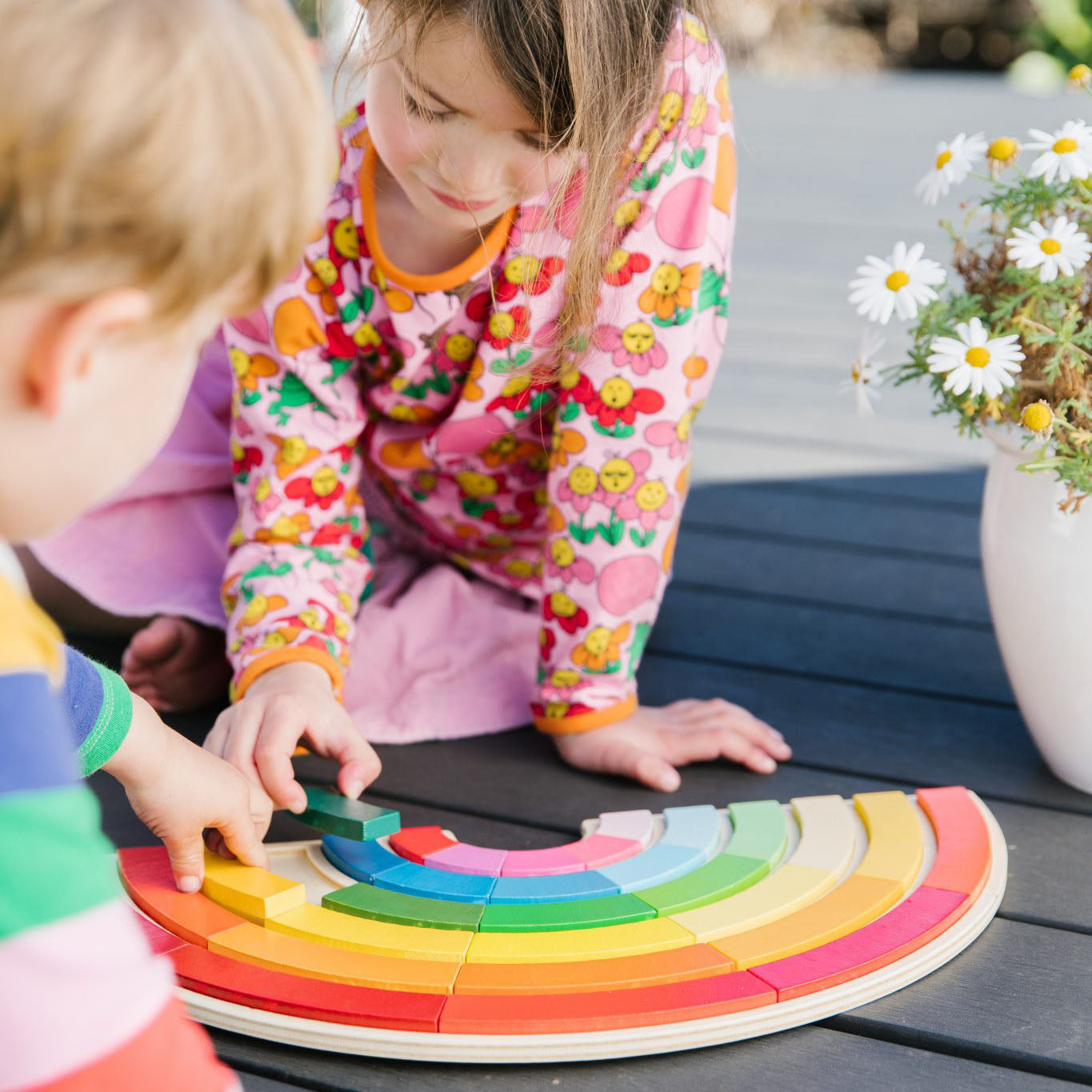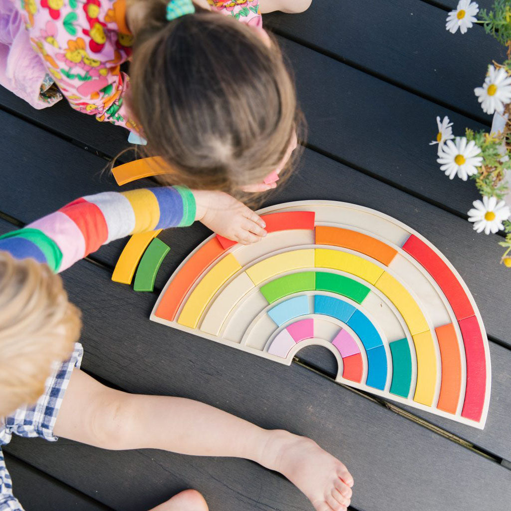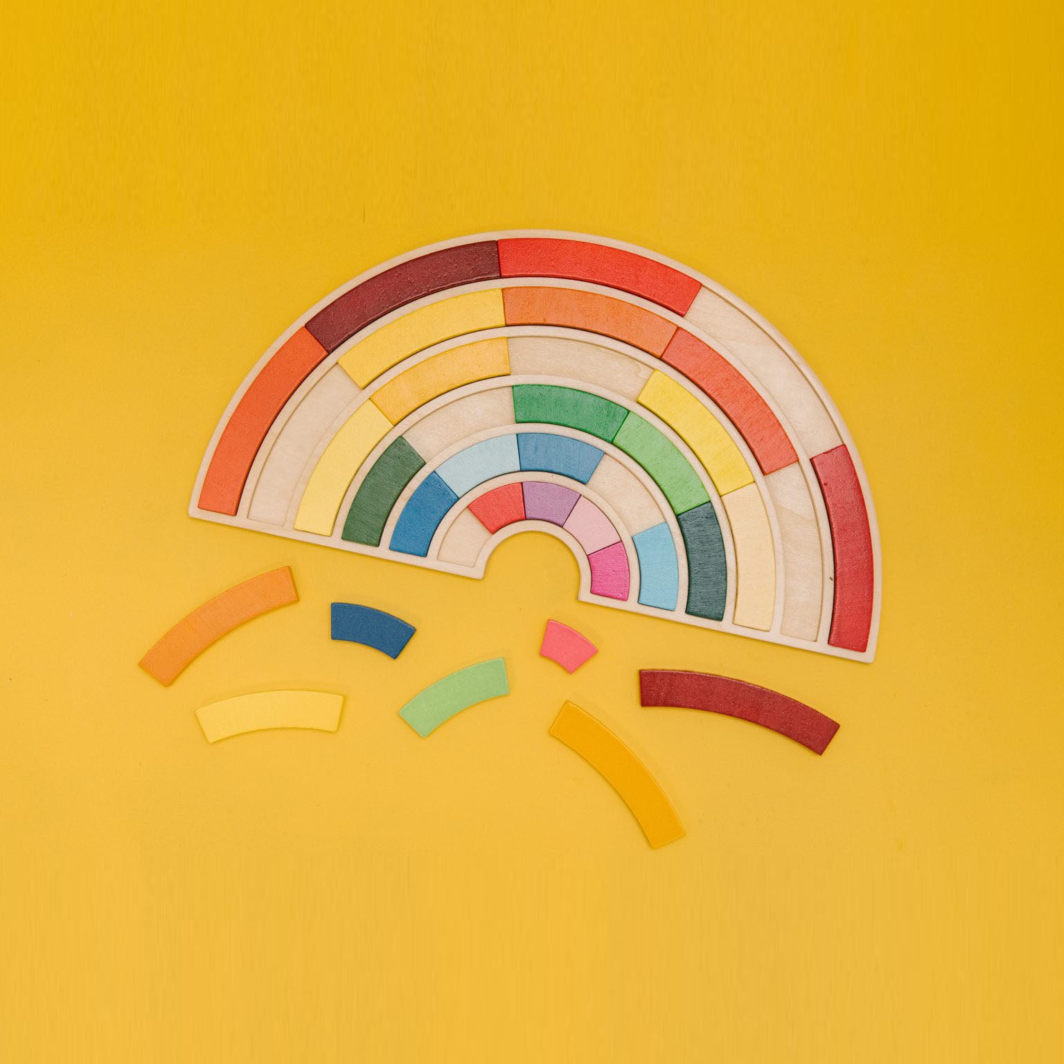 Das Set enthält 30 regenbogenfarbene Teile und ein Puzzlebrett. Alle Teile sind mit ungiftiger, kindersicherer Farbe bemalt. Puzzleteile und Puzzlebrett sind zusätzlich mit einem klaren Mattlack versiegelt. Hergestellt aus neuseeländischem FSC-Kiefernholz und Sperrholz.