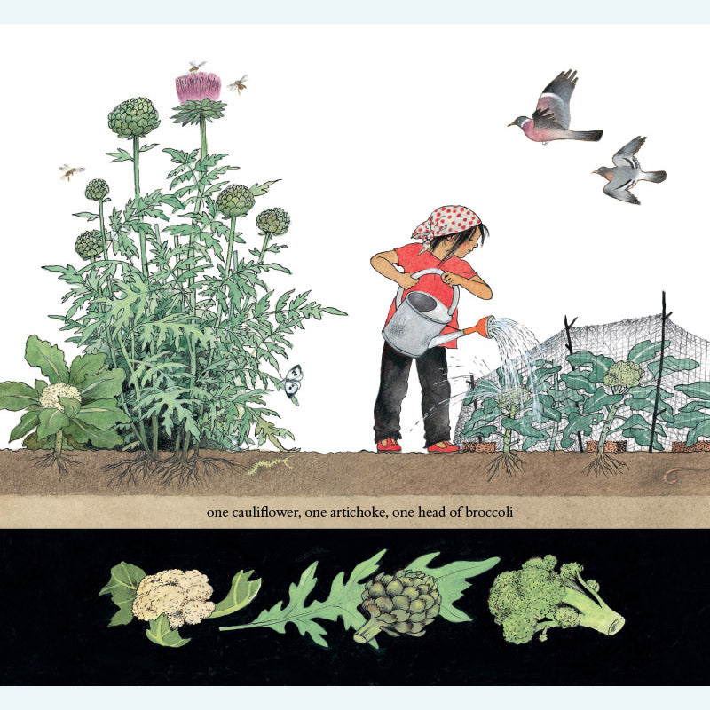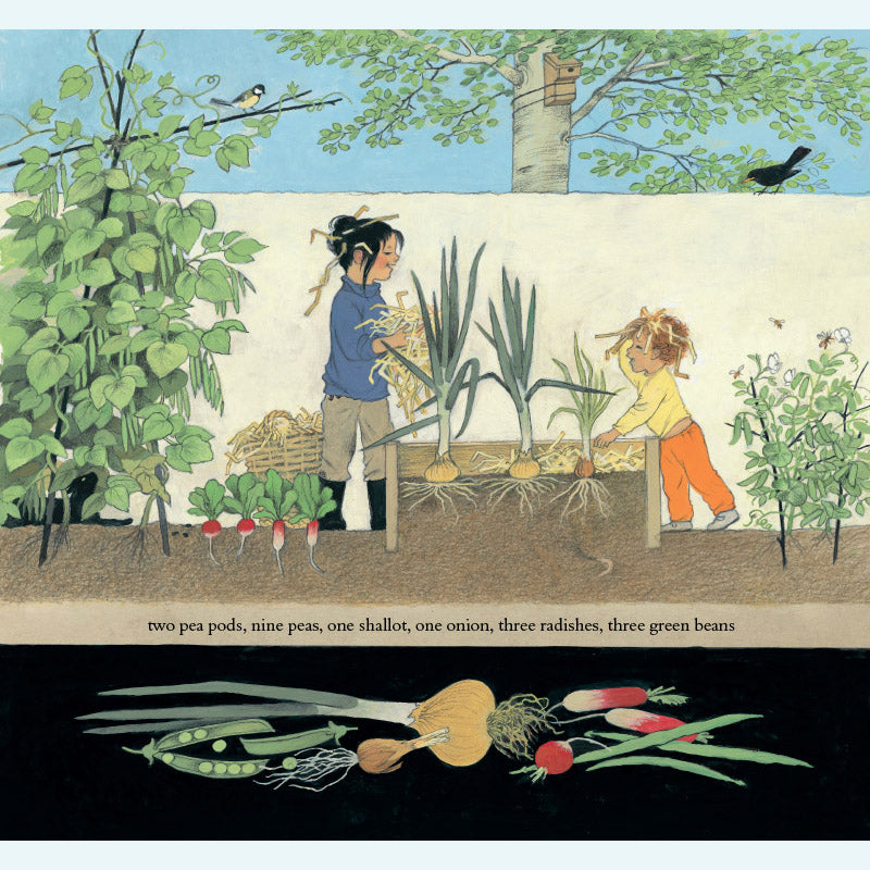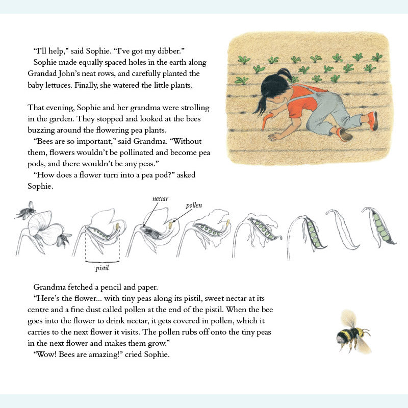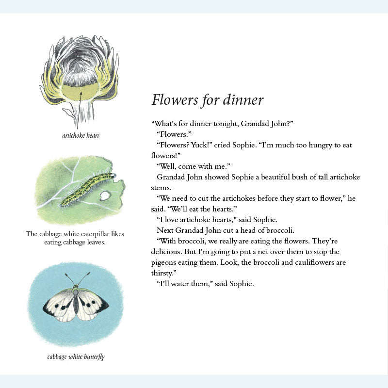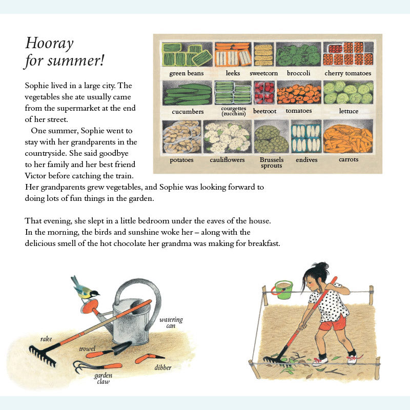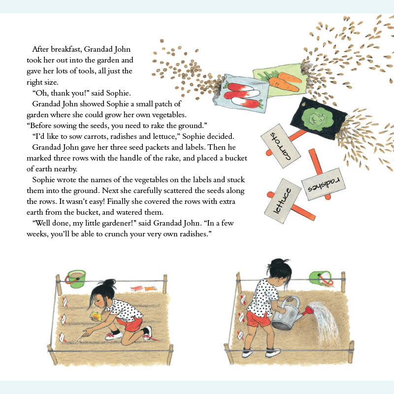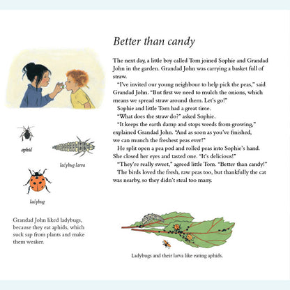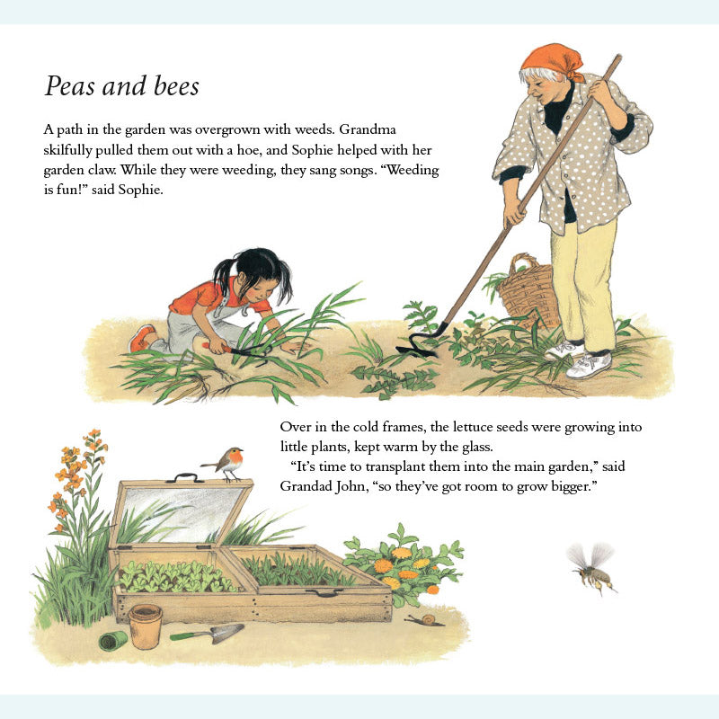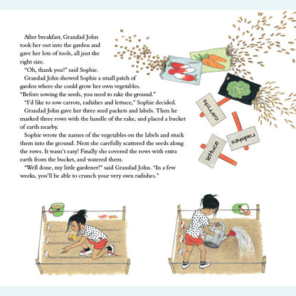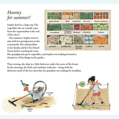 Sophie lebt in der Stadt und ihr Gemüse kommt aus dem Supermarkt. Dann besucht sie ihre Großeltern auf dem Land – und entdeckt bald, wie viel es über das Wachstum der Dinge zu lernen gibt! Sophie hilft ihrem Großvater durch die verschiedenen Jahreszeiten und lernt dabei, wie man Zwiebeln mulcht, Blumen isst, Unkraut jätet, Bienen macht, Salat zubereitet, Käfer fängt, umgräbt, erdet, pflückt und kompostiert. Als der Winter kommt, muss Sophie nach Hause – doch ihr Großvater hat noch eine letzte Überraschung für sie. Dies ist ein wunderbares Buch für Kinder, in dem sie mit Sophies neugierigen und fragenden Augen etwas über den Kleingarten- und Gemüseanbau lernen können. Gerda Mullers charaktervolle Illustrationen zeigen den Garten und seine Pflanzen im Frühling, Sommer, Herbst und Winter genau.
