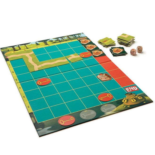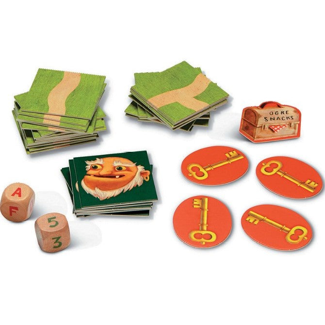 Players try to beat the ogre to the treasure by creating a path from START to END. Along the way they need to collect three keys to open the treasure. Players strategize, cooperate, and build the path together. If they do it before the ogre gets there, they all win!