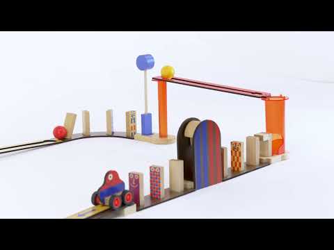 Recognized by the Selection of Ludolibrarians for its creativity and educational value, the Junior Racer set is a wooden chain reaction, puzzle and construction game for children aged 5 and over. Children copy the 3 designs in the instructions booklet to build the courses, or they can make up their own - the possibilities are endless. Highlights in the box include the wacky car and funny Zig domino characters.