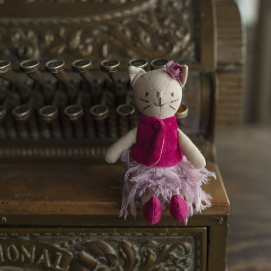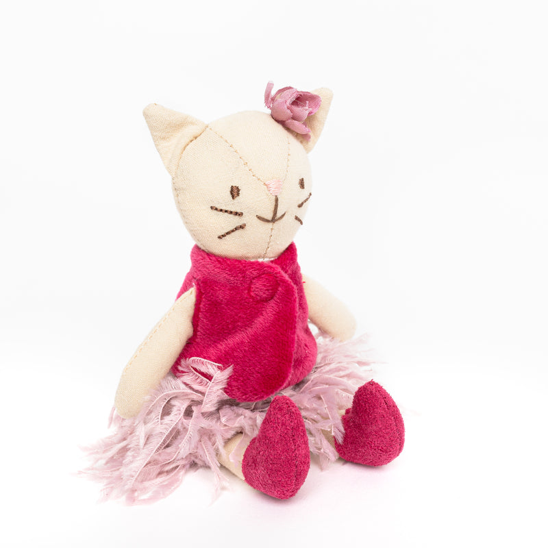 This fluffy, 16cm tall plush is made with soft, light brown fur and comes dressed in a hot pink vest, a feathery skirt, and a sweet rose in her ear.