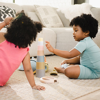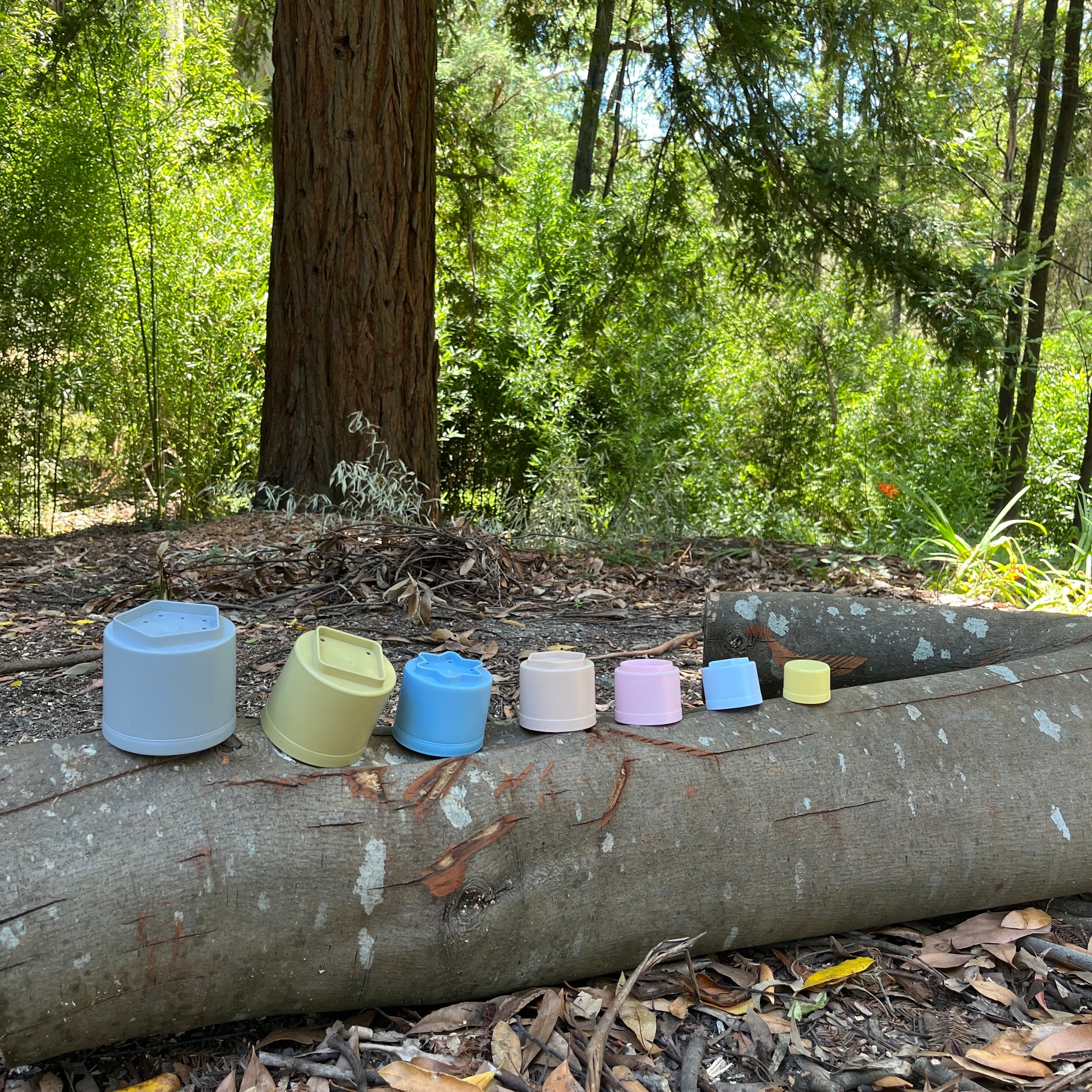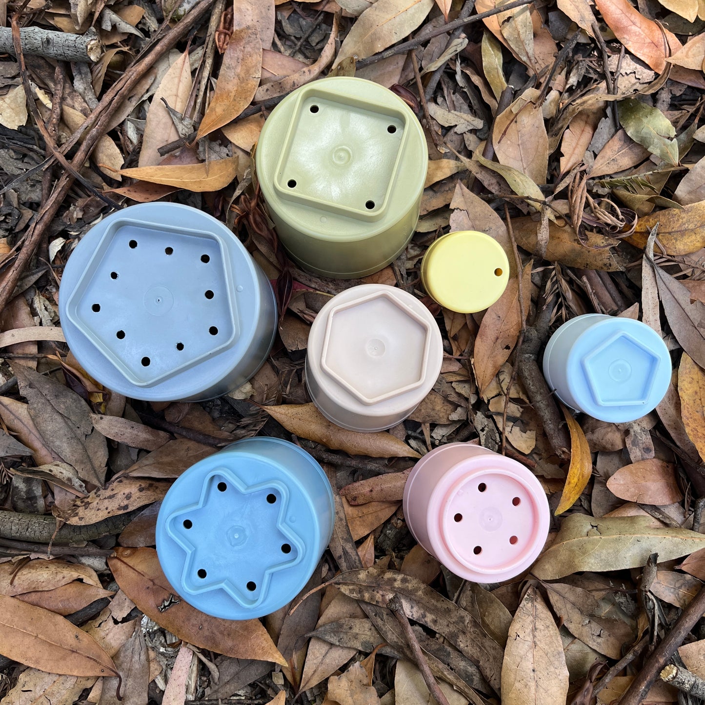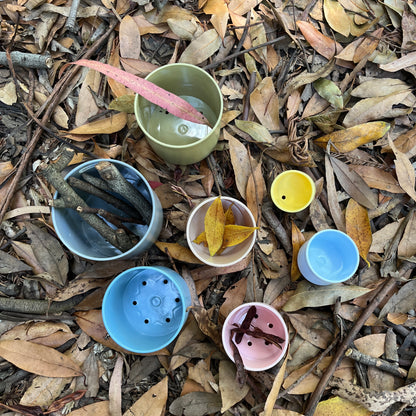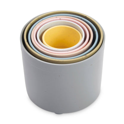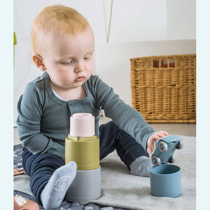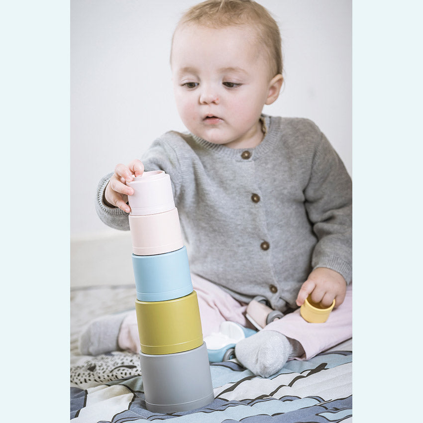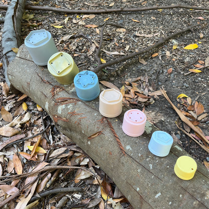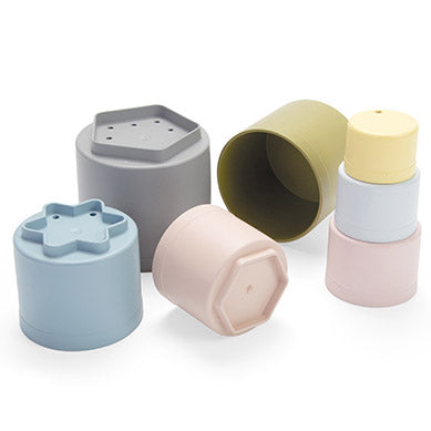 These multifunctional building cups stimulate a child's motor skills and play, both indoors and outdoors. The tiny play cups are stackable - and come tumbling down – for the great joy of any child. They can be used as moulds and cutters for baking cakes or modelling clay. The small holes in the bottom of the cups also make them ideal for playing with water in the bath or sandbox.