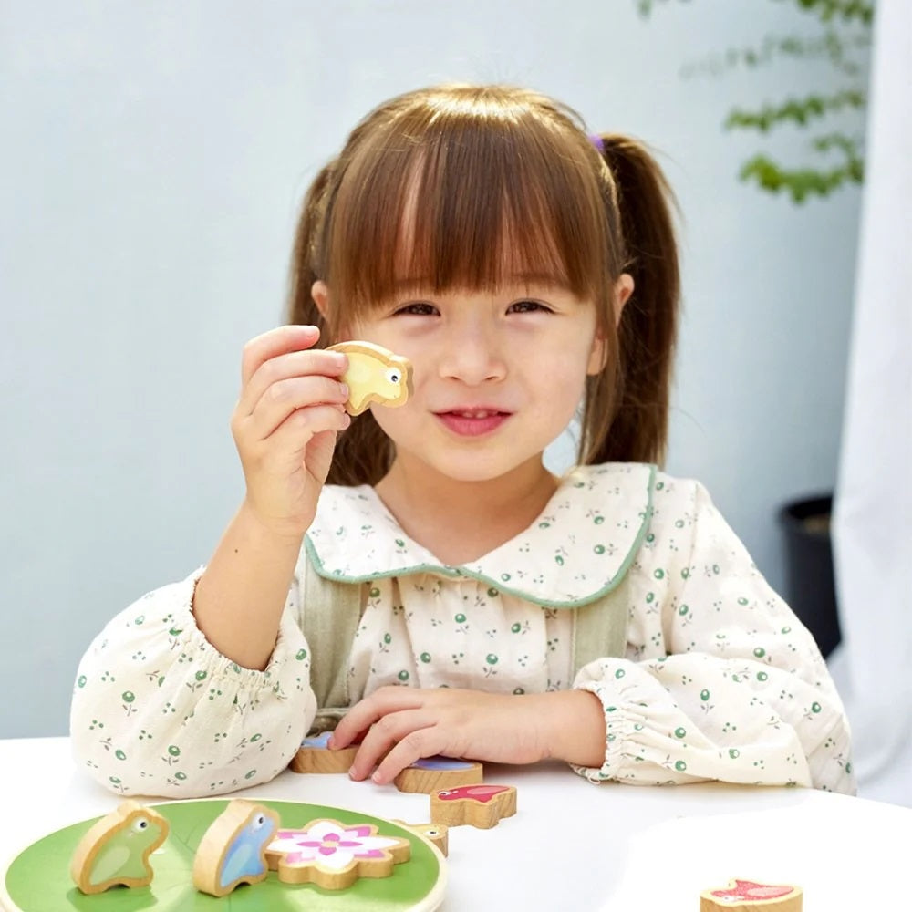 Made from smooth, natural wood and finished with safe, non-toxic paints, this toy offers tactile appeal and visual stimulation. The rounded base of the lily pad adds gentle movement, helping toddlers develop spatial awareness and hand–eye coordination as they learn to stack with care.