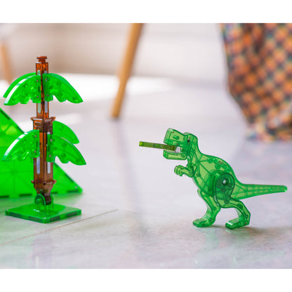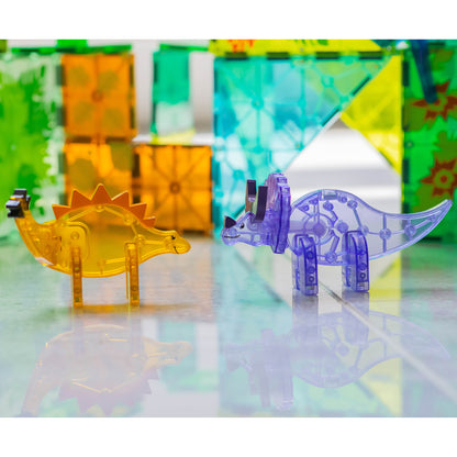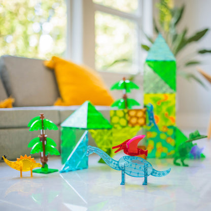 - Includes: 50 magnetic pieces, featuring all 6 Dinosaur Figurines, including Pteranodon (red), T-Rex (green), Stegosaurus (yellow), Velociraptor (blue), Triceratops (purple) and Brachiosaurus (Slate Blue), 16 Large Tiles (6 Large Squares, 6 Large Right Triangles, 4 Large Equilateral Triangles), 8 Squares, 2 Right Triangles, 2 Extendable Tree Bases, 16 Tree Leaves