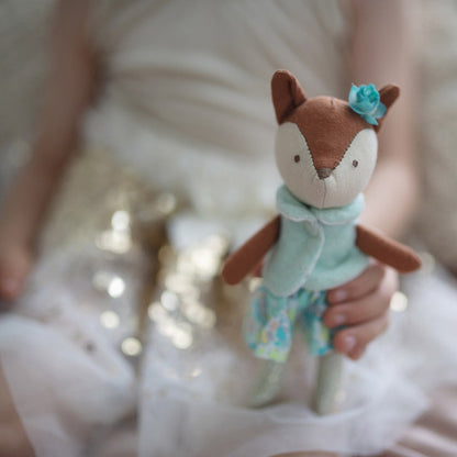 Dressed in a beautiful teal vest, flowery dress and matching flower in her ear, this plush toy is irresistibly cuddly. Soft to the touch and just the right size to fit in little hands, this fox plush makes a perfect companion for children and adults who love animals. Give it as a gift or keep it for yourself as a cute addition to your collection.