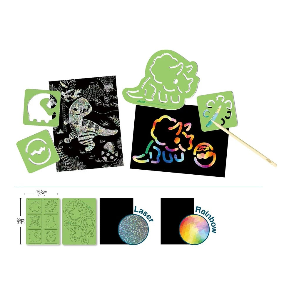 Scratch into a prehistoric world with the Dinosaur Stencil Scratch Art Set – a roaringly fun way to create bold dino designs! Kids can use eight dinosaur-themed stencils to scratch and reveal T-Rexes, Stegosauruses, and more. Each stencil helps bring prehistoric scenes to life with vibrant colours hidden beneath a special black coating.
