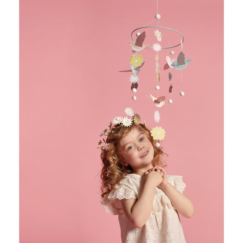 A stunning springtime-themed mobile. With its flowers and birds that dance gracefully through the air, this softly coloured mobile makes a beautiful decorative addition to a baby or child's room. The design features include;