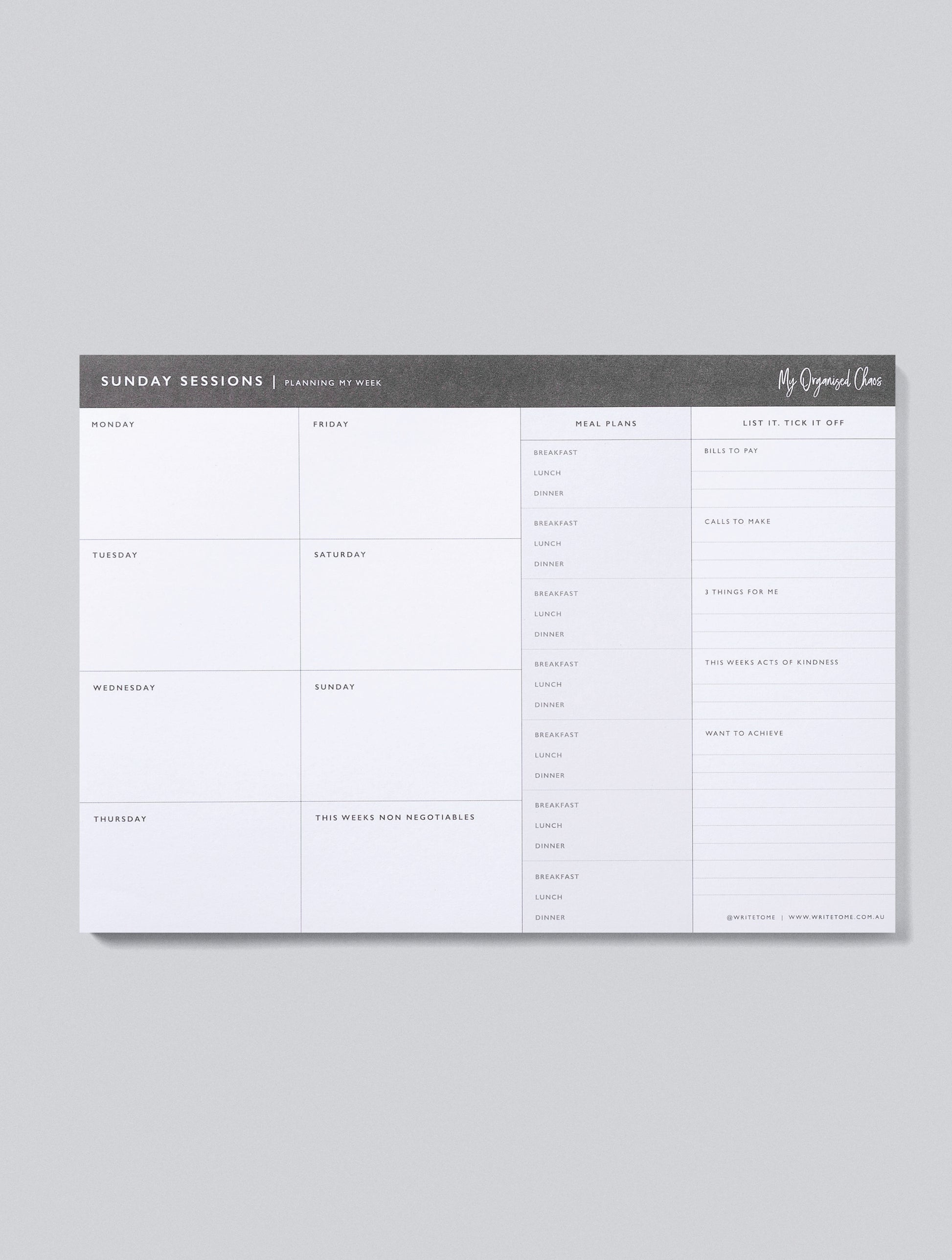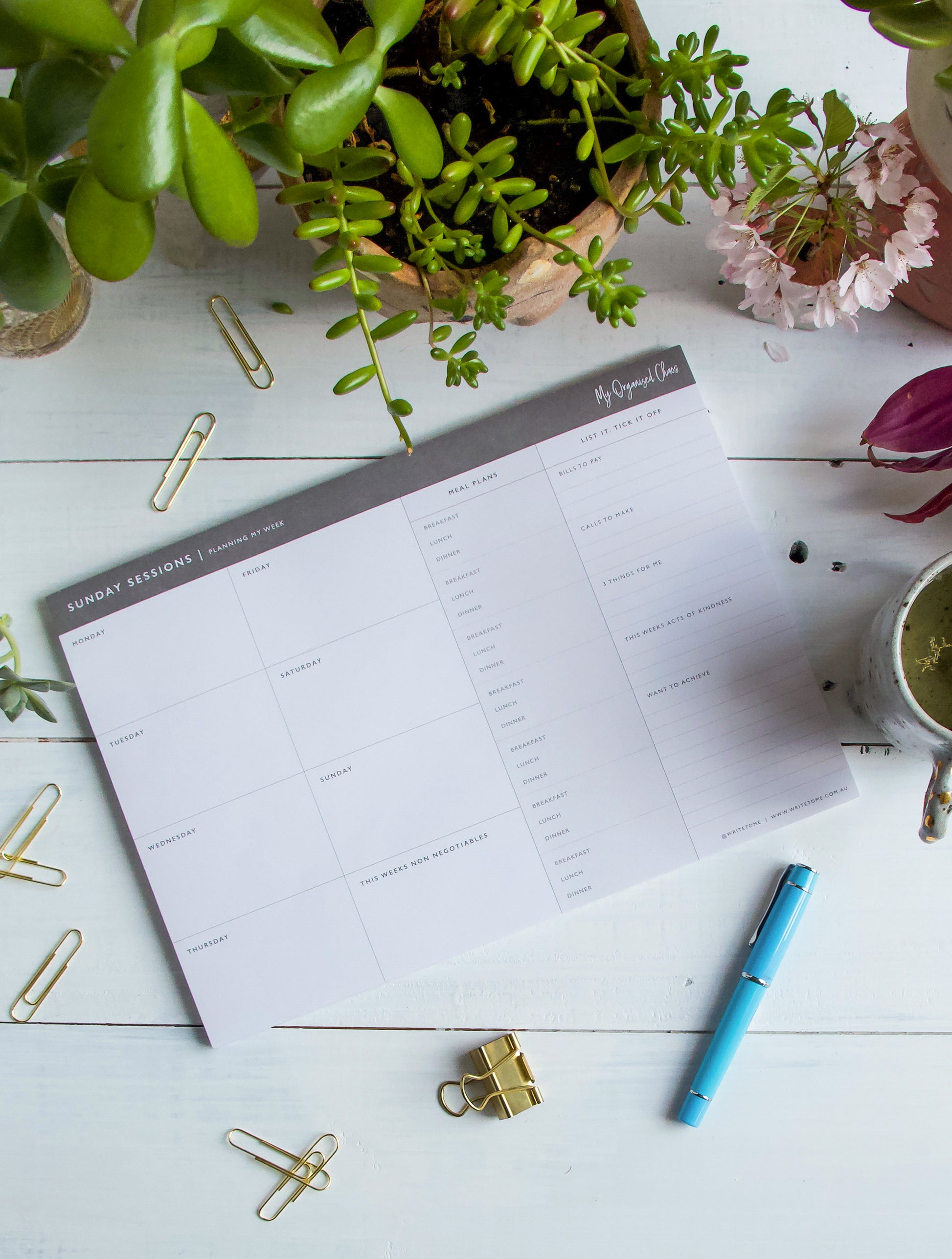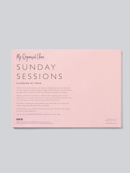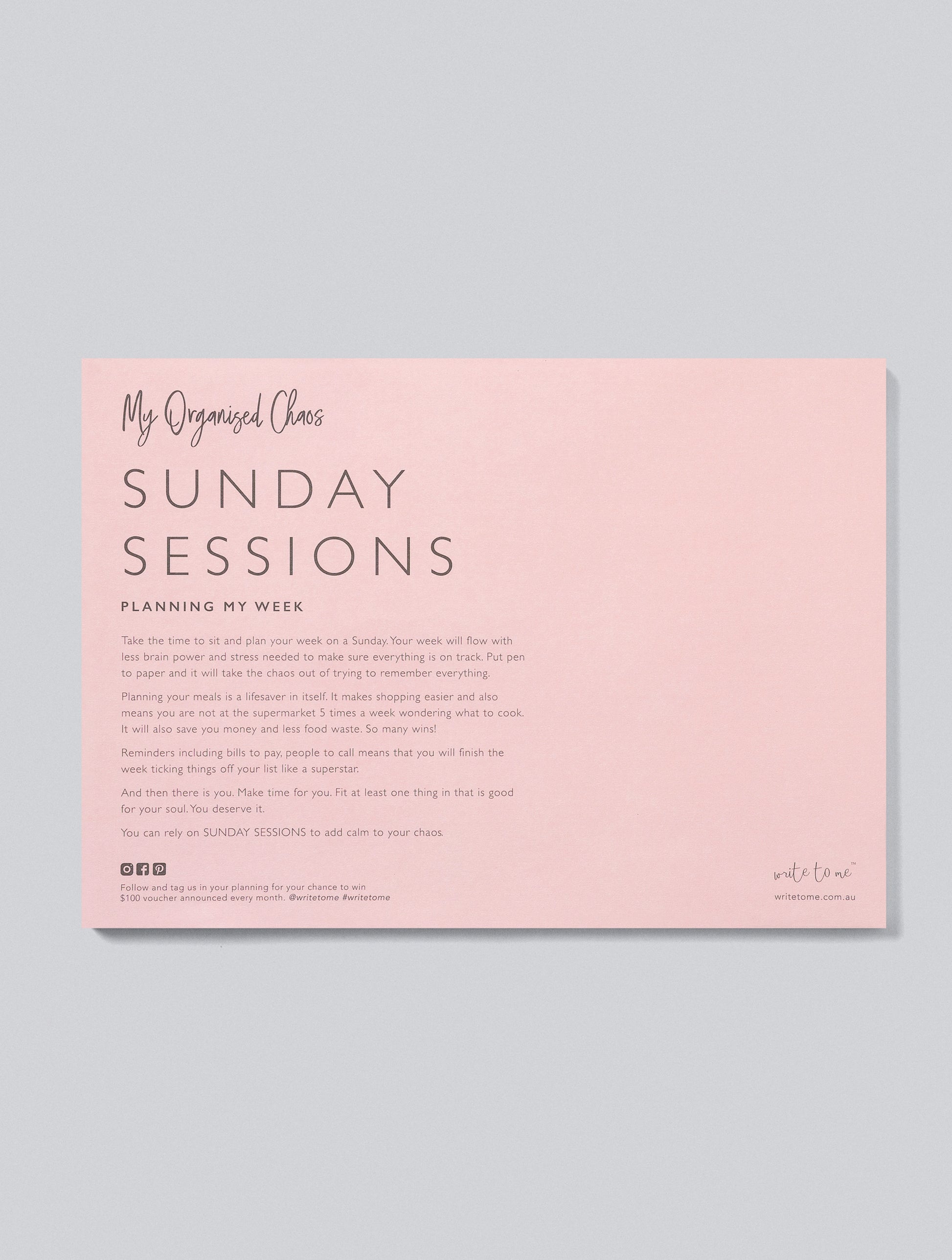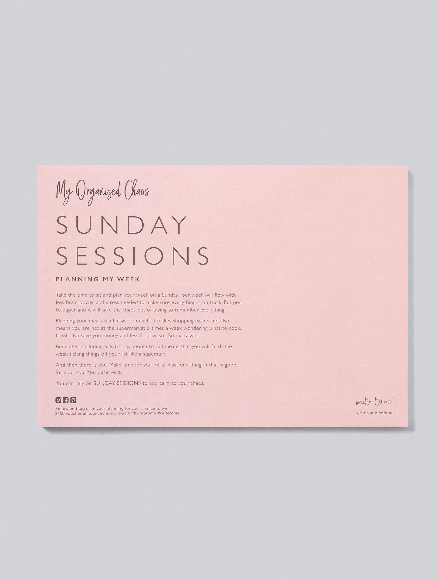 Take the time to sit and plan your week on a Sunday. Your week will flow with less brain power and stress needed to make sure everything is on track. Put pen to paper and it will take the chaos out of trying to remember everything. You can rely on SUNDAY SESSIONS to add calm to your chaos